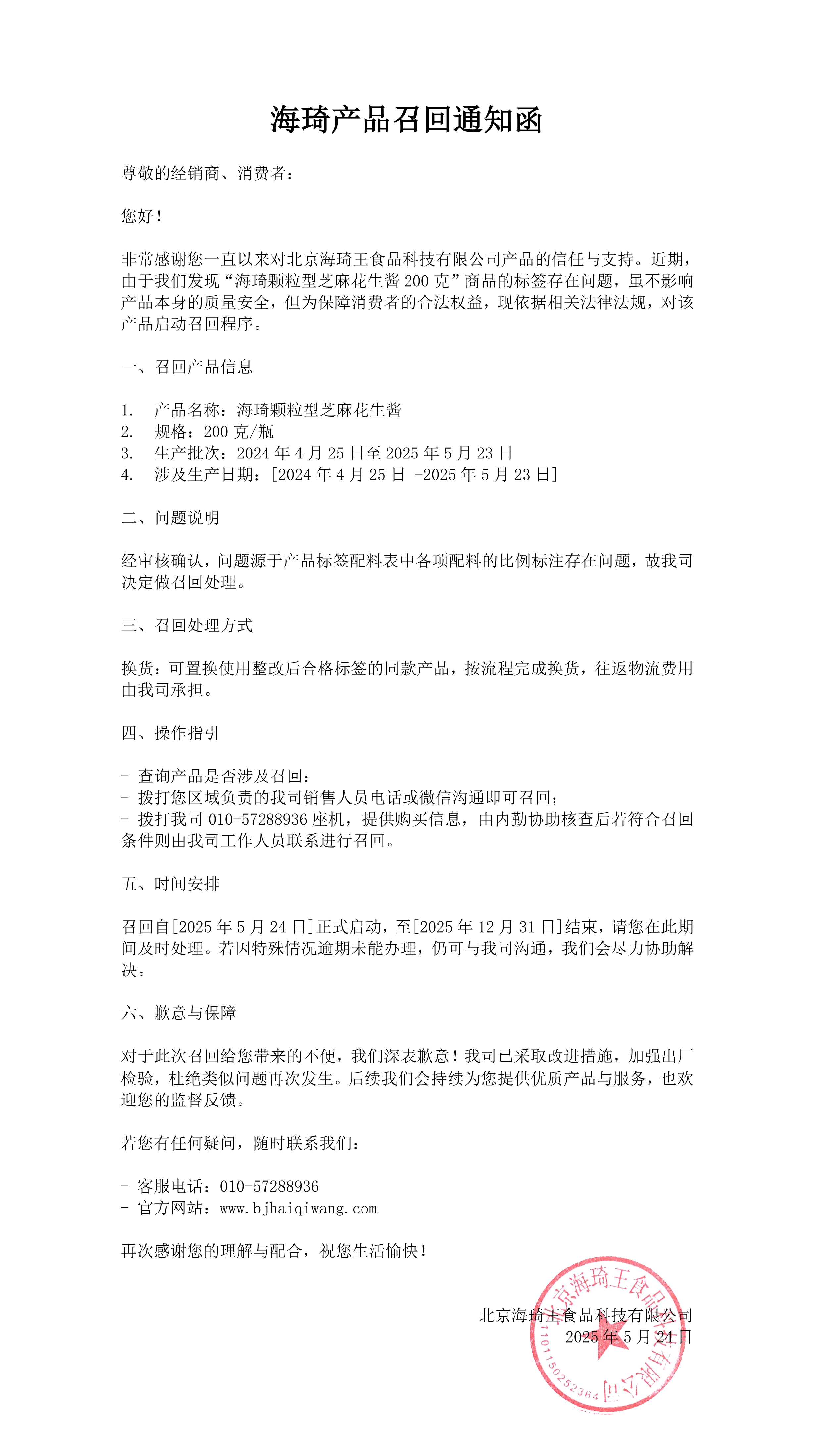 海琦產(chǎn)品召回通知函